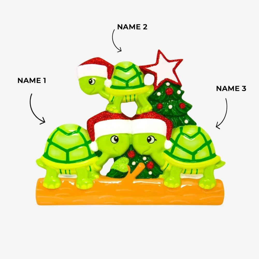 Celebrate your family’s unique bond with the "Turtle Family of 3" ornament. Crafted from high-quality ceramic, this charming design features a trio of turtles, each adorned with colorful shells and personalized with names. Hand-painted with intricate details and a glossy finish, this ornament captures the gentle and enduring nature of your family. The turtles' friendly expressions and vibrant colors add a whimsical touch to your holiday decor. Complete with a ribbon for easy hanging and presented in a festive gift box, this ornament is a perfect keepsake for cherishing family moments and adding a touch of fun to your seasonal celebrations.