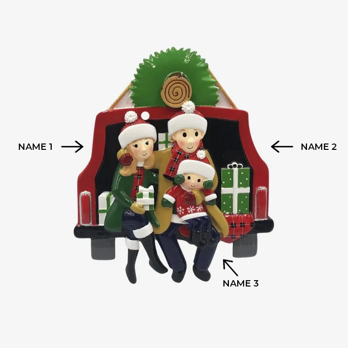 This charming "Woody Car Family of 3" ornament captures the nostalgic spirit of holiday road trips in a vintage style. The ornament features a classic wood-paneled station wagon, adorned with festive touches, carrying a Christmas tree on the roof. Personalized with three family members, each figure is lovingly detailed, creating a heartwarming scene. Perfect for celebrating the joy of family, this ornament adds a personal and whimsical touch to your holiday decor. Ideal for gift-giving or to cherish as a family keepsake, it’s a delightful reminder of togetherness during the holiday season.